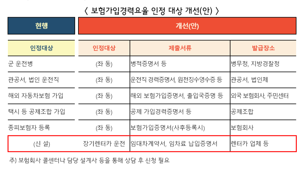 하지만 최근에는 차량 구매 대신 장기렌터카를 이용하는 사례가 늘어나면서, 장기렌터카 운전 기간이 보험가입 경력으로 인정되지 않아, 실제로 운전 경력이 있음에도 불구하고 본인 명의로 보험 가입 시 보험료 할인을 받지 못하는 불합리한 상황이 발생하고 있습니다.